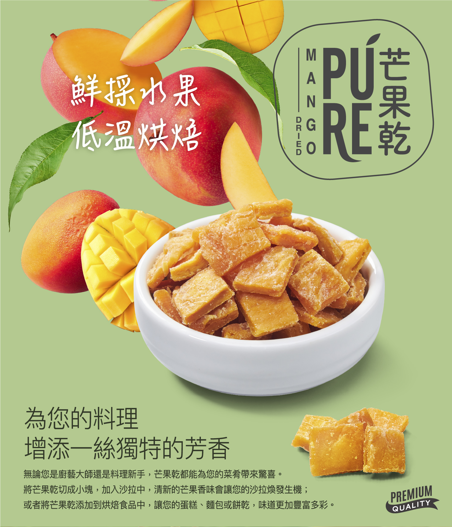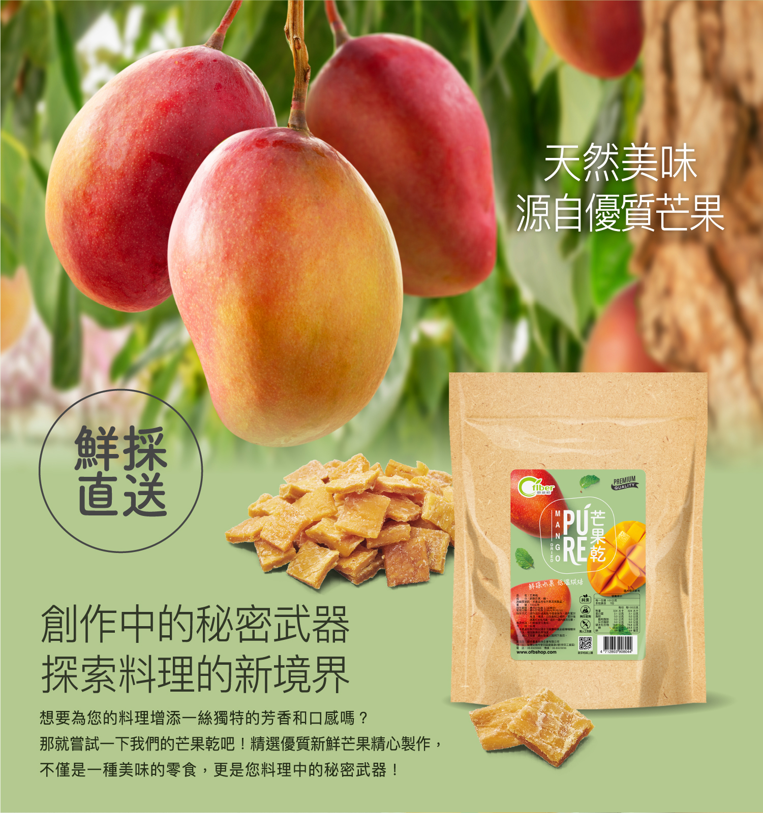 鮮採芒果乾推薦,就選歐菲栢的愛文芒果乾!我們的無添加芒果乾經料理職人精選推薦,無糖且不含任何人工成分,保留了愛文芒果的天然甜美與芳香。這款芒果乾無論用於料理還是烘焙,都能為您的佳餚增添一絲獨特風味,成為您廚房中的秘密武器。選擇歐菲栢,品味自然、健康的芒果乾!