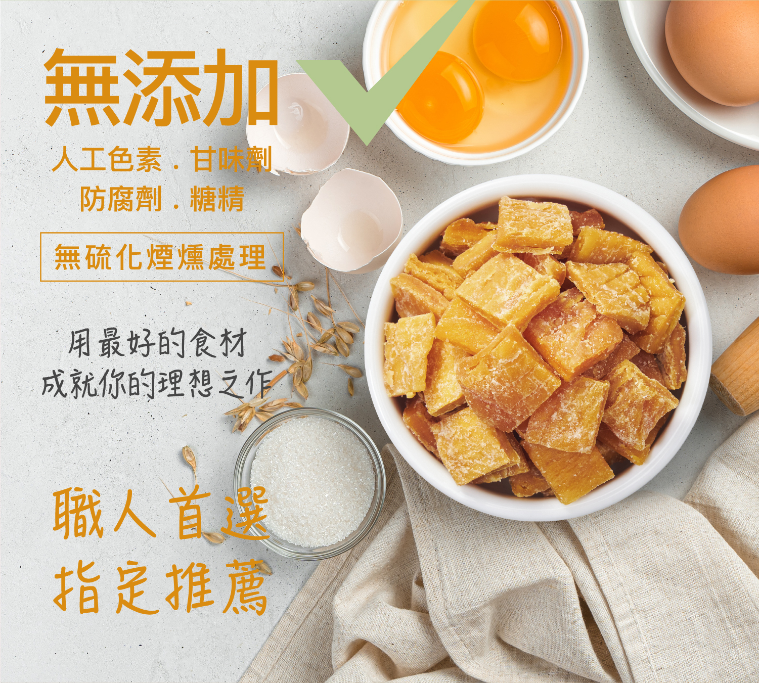 本產品不添加色素和防腐劑。因梅納反應及酵素作用,產生褐變現象及白色糖晶狀況,此乃正常反應,請安心食用,放於冷藏保存即可避免。